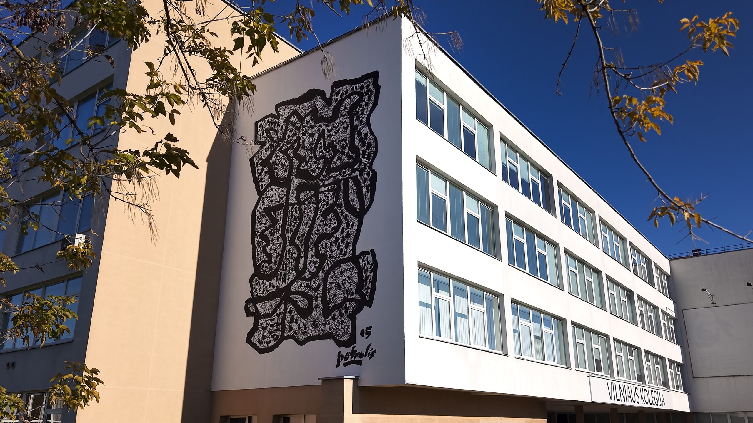 Klasikinis menas susitinka su gatvės menu: ant Vilniaus kolegijos sienos atgimė Algirdo Petrulio šilkografija