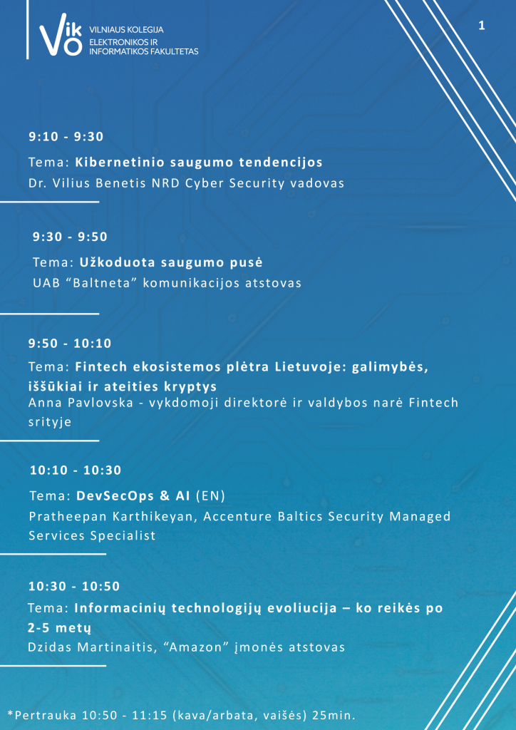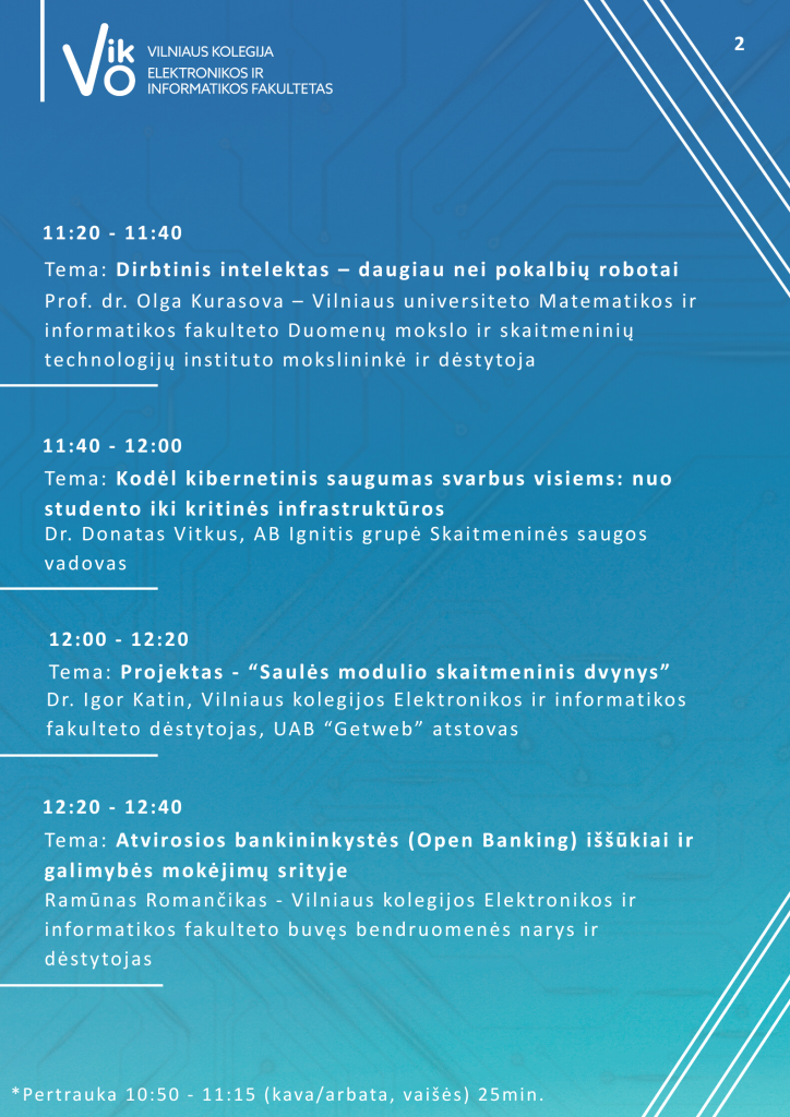 Pranešimuose bus nagrinėjamos informacinių sistemų, saugos, programavimo, elektronikos ir kompiuterių inžinerijos temos, taip pat aptariama mokslo ir verslo sąveika, jų sinergija ir svarba technologijų plėtrai, žinių perdavimui bei praktinių sprendimų kūrimui.