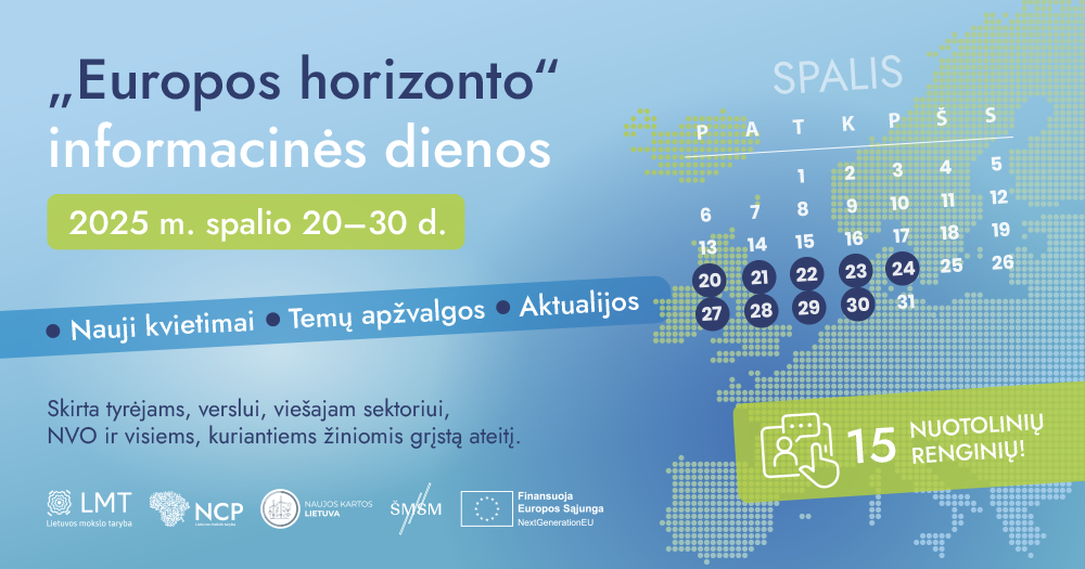 2025 m. spalio 20–30 d. kviečiame visus besidominčius programos „Europos horizontas“ galimybėmis dalyvauti informacinėse dienose: jūsų patogumui net 15 skirtingų teminių renginių, apimančių visas „Europos horizonto“ veiklos sritis ir programas. Informacinių dienų metu bus pristatomi 2026 m. „Europos horizonto“ kvietimai.