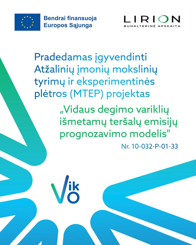 Vilniaus kolegija pradeda įgyvendinti atžalinių įmonių mokslinių tyrimų ir eksperimentinės plėtros (MTEP) projektą „Vidaus degimo variklių išmetamų teršalų emisijų prognozavimo modelis” (Nr. 10-032-P-01-33). Projekto koordinatorius MB Lirion, VIKO yra projekto partneris.