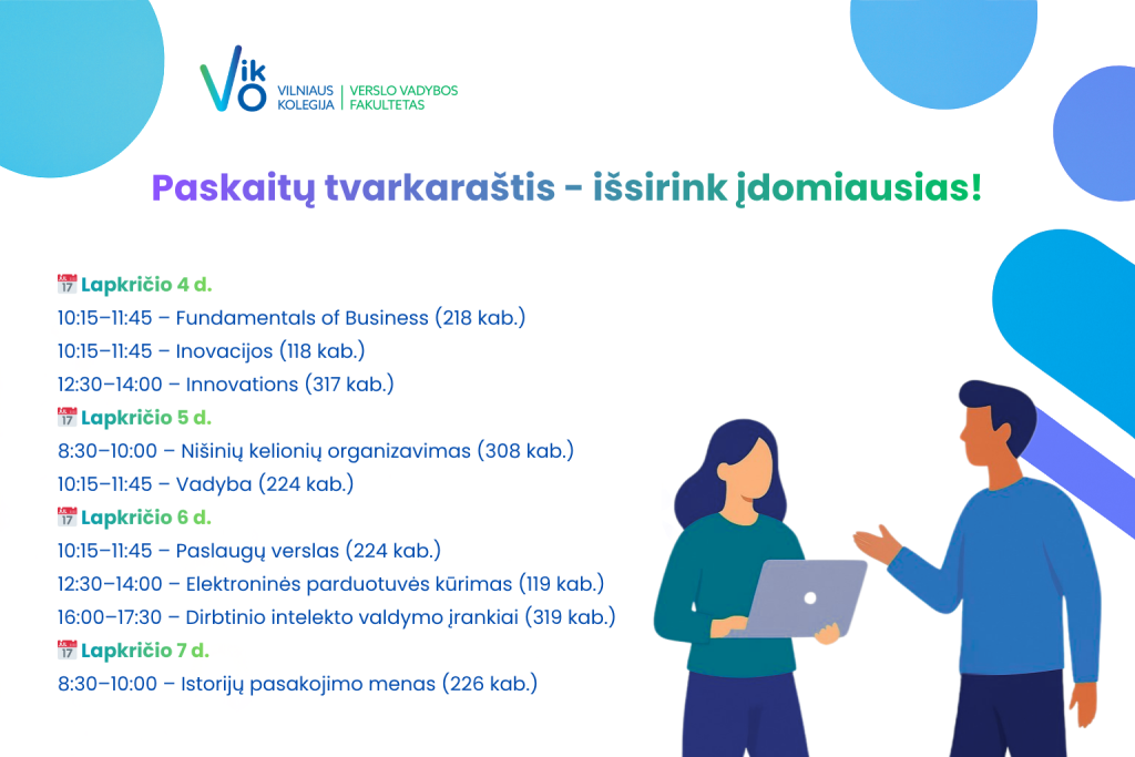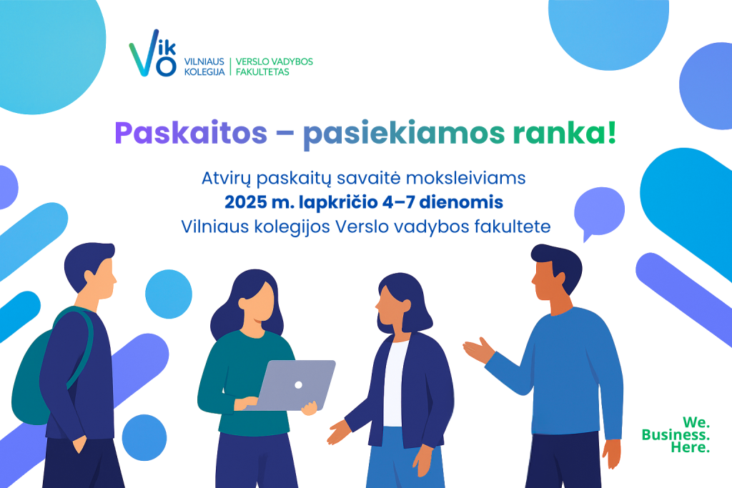 Kviečiame dalyvauti atvirų paskaitų savaitėje Vilniaus kolegijos Verslo vadybos fakultete! Tai puiki galimybė iš arčiau susipažinti su studijų aplinka, dėstytojais, dalyvauti praktinėse veiklose ir pamatyti, kaip atrodo studento diena.