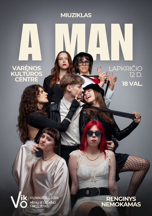 Vilniaus kolegijos Menų ir dizaino fakulteto Muzikinio teatro studijų programos studentai kviečia Jus į savo baigiamojo darbo pristatymą – miuziklą „A Man“ (liet. „Vyras“).