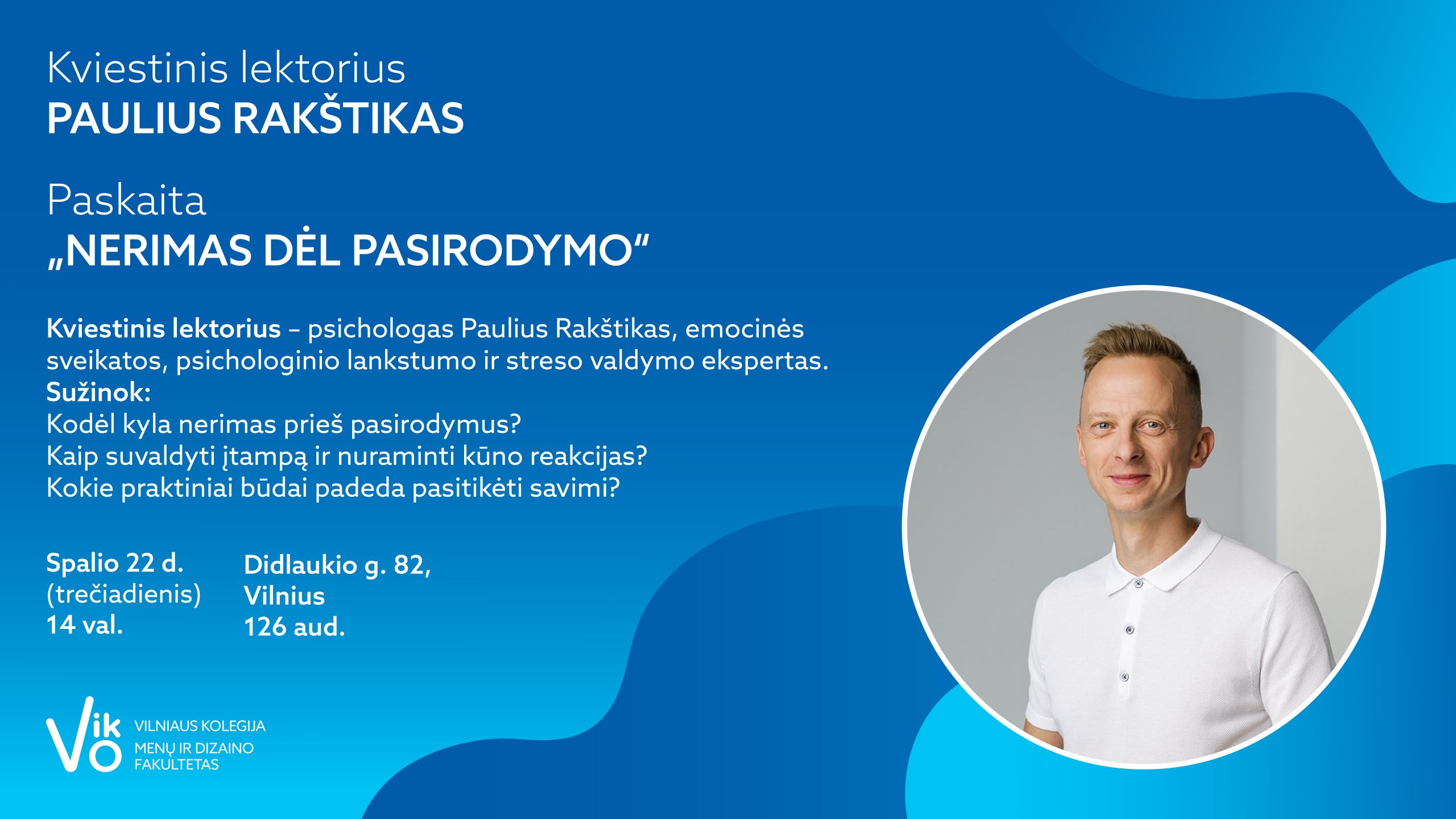 Kviečiame į paskaitą, kurią ves kviestinis lektorius – psichologas Paulius Rakštikas. Jo ekspertinės sritys – emocinė sveikata, psichologinis lankstumas ir streso valdymas. Lektorius turi daugiau nei 15 metų patirtį mokymų srityje bei kūrybinių projektų įgyvendinime, yra iniciatyvos pauze.lt įkūrėjas ir knygos „Staigmena gyventi“ autorius.