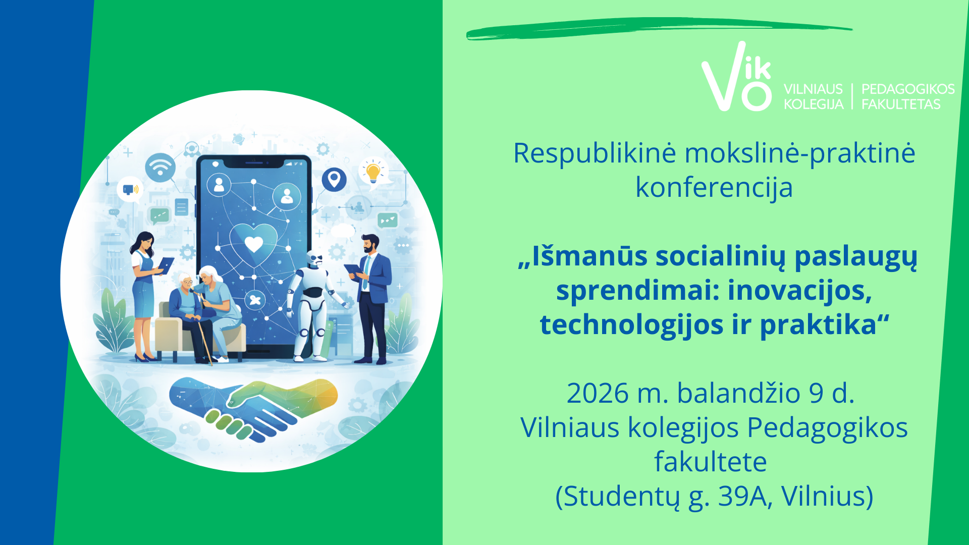 Kviečiame dalyvauti respublikinėje mokslinėje-praktinėje konferencijoje „Išmanūs socialinių paslaugų sprendimai: inovacijos, technologijos ir praktika“, kuri vyks 2026 m. balandžio 9 d. Vilniaus kolegijos Pedagogikos fakultete (Studentų g. 39A, Vilnius).