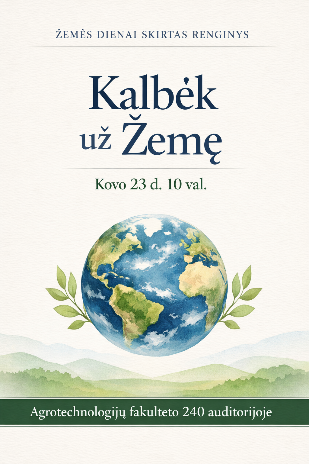 Kovo 23 d. 10 val. Agrotechnologijų fakulteto 240 auditorijoje vyks Žemės dienai skirtas švietėjiškas renginys „Kalbėk už Žemę“. Jame Agrotechnologijų fakulteto studentai pristatys aktualius pranešimus apie aplinkosaugą ir tvarumą.