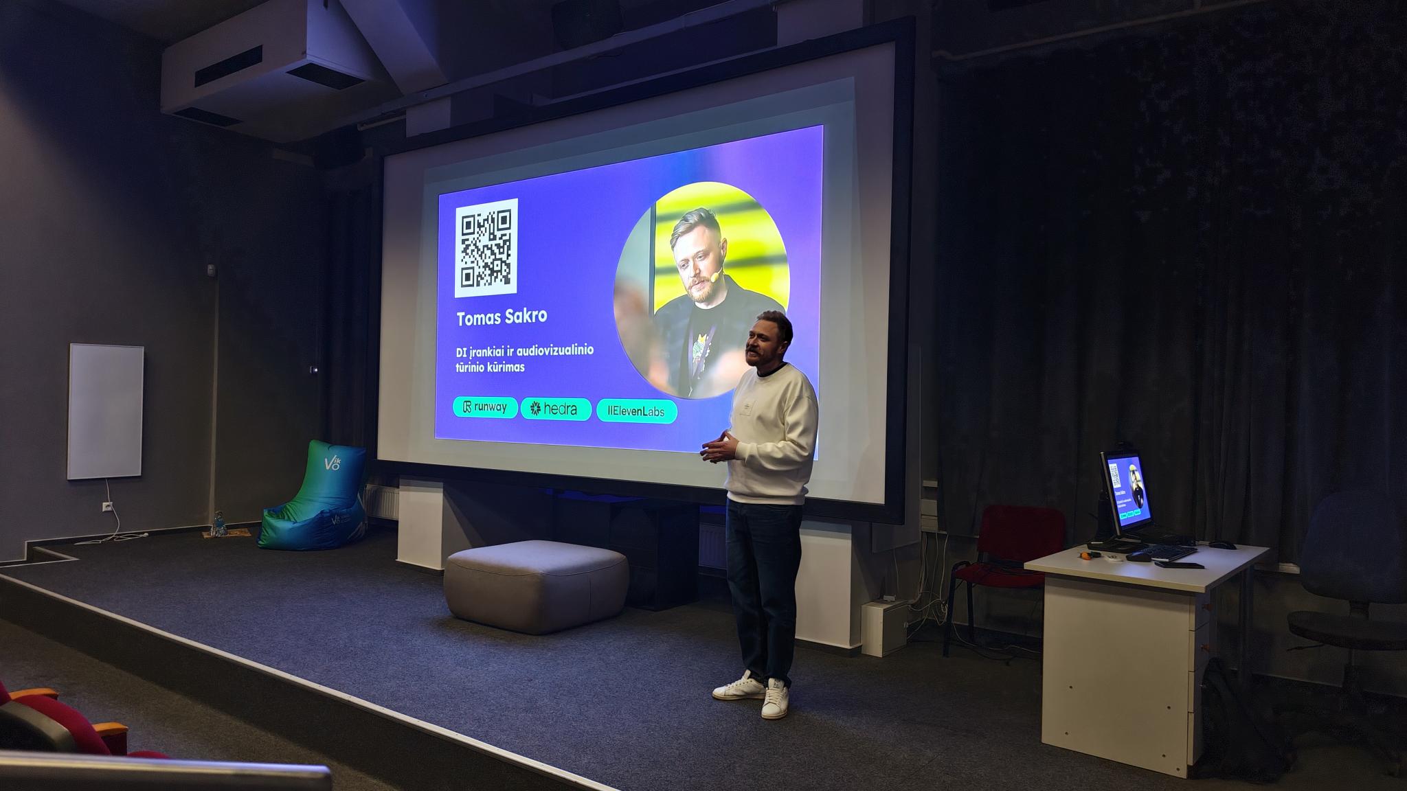 Jis ne tik pristatė naujausius DI įrankius (Runway, Hedra, ElevenLabs), bet ir pasidalino tikrais pavyzdžiais, patirtimi bei kūrybinėmis idėjomis.