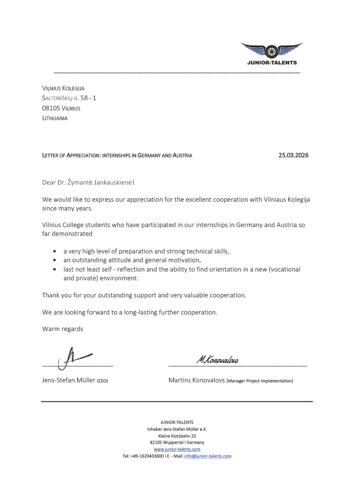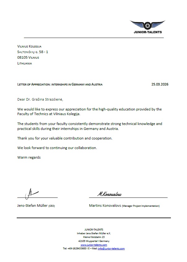 Vilniaus kolegijos Technikos fakultetas sulaukė reikšmingo tarptautinio įvertinimo – Vokietijos įmonė Junior-Talents įteikė padėkos raštus už aukštą studentų parengimo kokybę ir jų sėkmingą dalyvavimą tarptautinėse profesinėse praktikose.