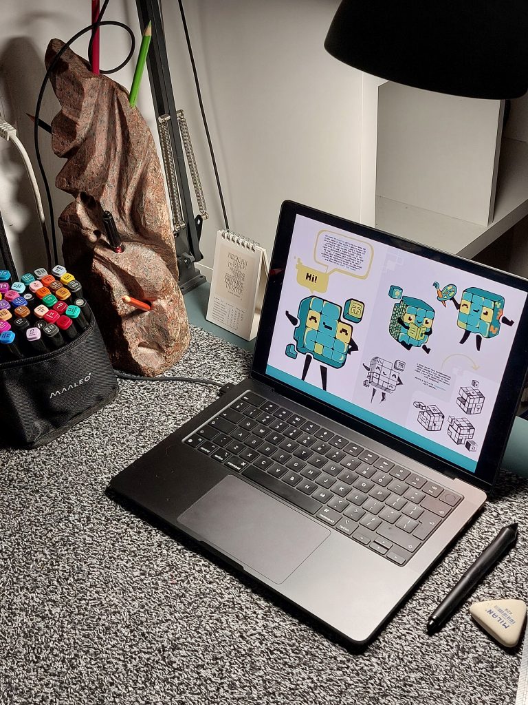 Taip gimė Kubicus — personažas, kurio kūnas veikia kaip ekranas: keičia spalvas, rodo emocijas, perteikia skirtingas nuotaikas. Jis gali transformuotis — virsti paprastu kubu, kuris tinka animacijai ir įvairiems formatams. Kūrėja sąmoningai pasirinko abstrakčią, geometrinę formą, o ne konkretų veikėją, tai leidžia personažą pritaikyti daugelyje kontekstų. O kokį charakterį turi Kubicus? Anastasijos žodžiais – jis žingeidus, optimistiškas, norintis viską pabandyti. Bet yra ir kita pusė: kai domiesi viskuo, dėmesys išsisklaido. „Per daug energijos ir trūksta koncentracijos – juokiasi Anastasija – bet gal mes, dabartiniai studentai, visi tokie truputį esam.“