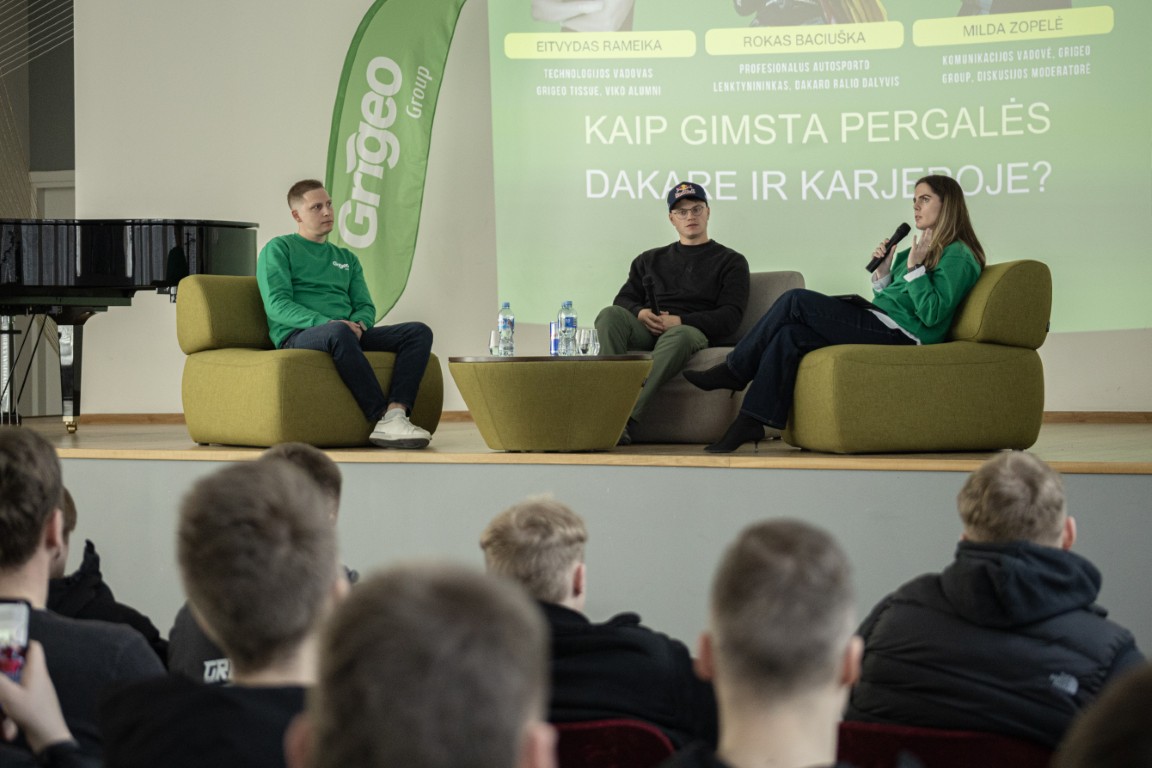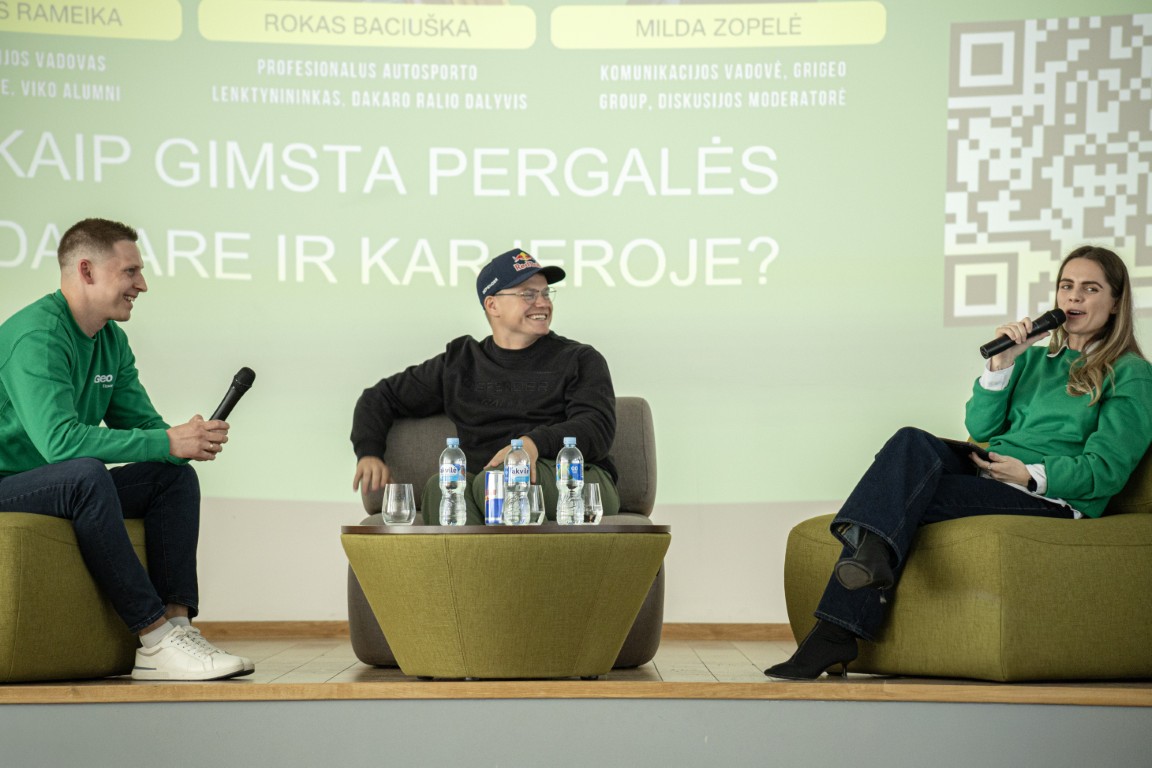 Šį kartą apie visa tai kovo 24 dieną studentai buvo kviečiami į diskusiją su Dakaro lenktynininku Roku Baciuška ir „Grigeo Tissue“ technologijos vadovu, VIKO Alumni Eitvydu Remeika.