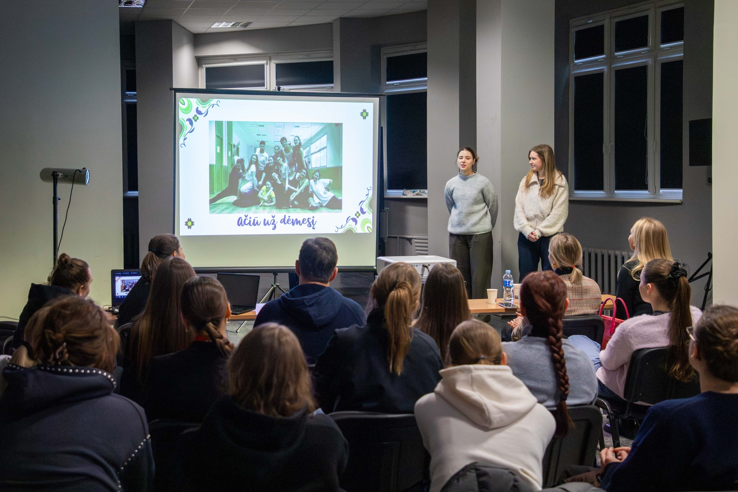 Muzikinio teatro trečio kurso studentės Patricija Bagdonavičiūtė ir Salomėja Pakerytė pristatė temą „Erasmus+: tarptautinė studijų patirtis ir galimybių spektras“, aptardamos akademinius ir kultūrinius iššūkius studijuojant užsienyje.