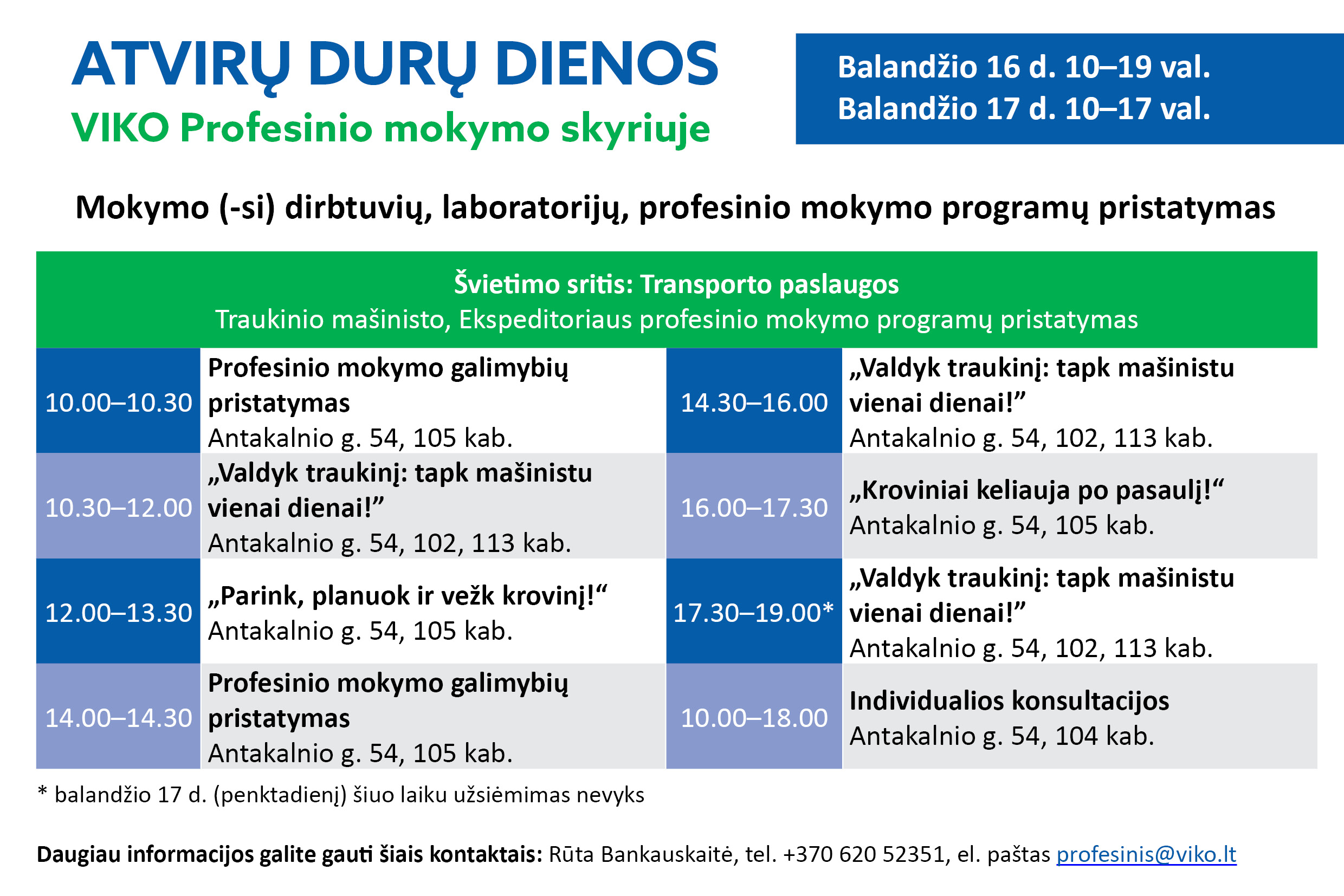 Tai puiki galimybė iš arčiau pažinti traukinio mašinisto ir ekspeditoriaus profesijas, taip pat patirti praktinio mokymo veiklas bei susipažinti su moderniausia įranga ir technologijomis, kurios naudojamos kasdien. Renginio metu lankytojai galės dalyvauti simuliacijose, praktinėse užduotyse, susipažinti su Vilniaus kolegijos Profesinio mokymo skyriaus mokytojais ir dabartiniais mokiniais, aptarti studijų programas ir karjeros galimybes.